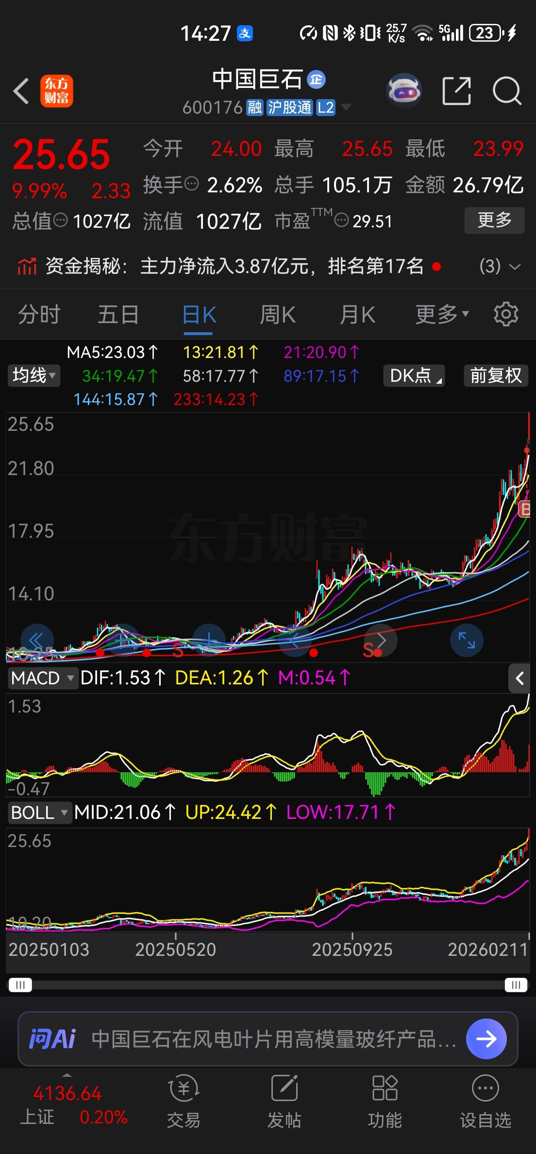 $中国巨石(SH600176)$ 为什么昨天收盘盘后买,因为站上了历史新高,突破历史新高意味着没有套牢盘,基本面处于戴维斯双击,顺势而为,方得始终,前面看了一个票叫利通电子,但是基本面不太好,所以没有买。。也是一种缘分吧,错过就错过了吧$利通电子(SH603629)$ #机构强推光纤、CPO:云厂商资本开支强劲#