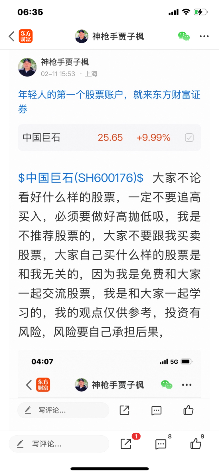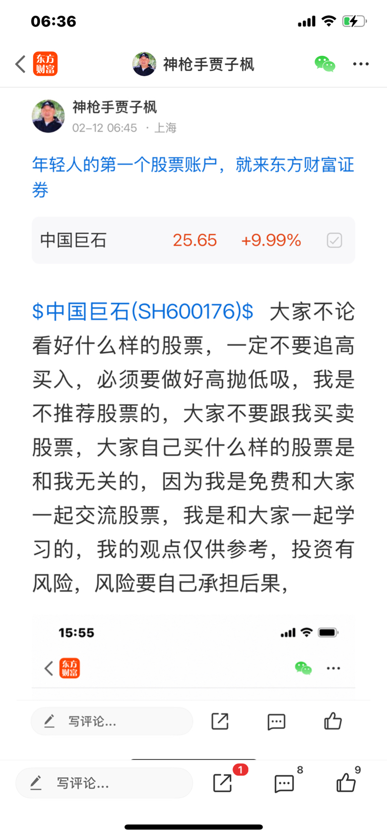 $中国巨石(SH600176)$ 这个股我是二月十一号发表文章看好的股票,大家不要追高买入,必须要做好高抛低吸,我是不推荐股票的,大家不要跟我买卖股票,大家自己买什么样的股票是和我无关的,因为我是免费和大家一起交流股票,我是和大家一起学习的,我的观点仅供参考,投资有风险,风险要自己承担后果,