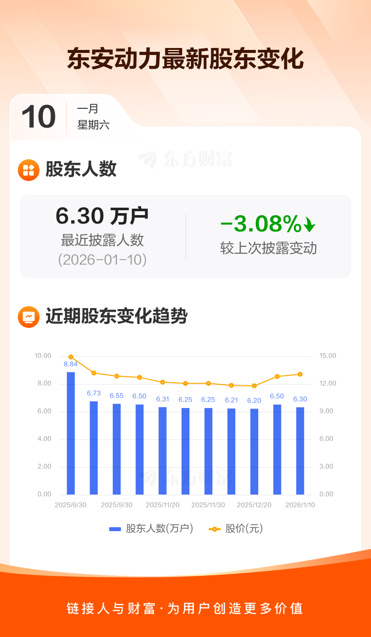 东安动力:截至1月10日最新股东户数6.30万户,较上期减少3.08%