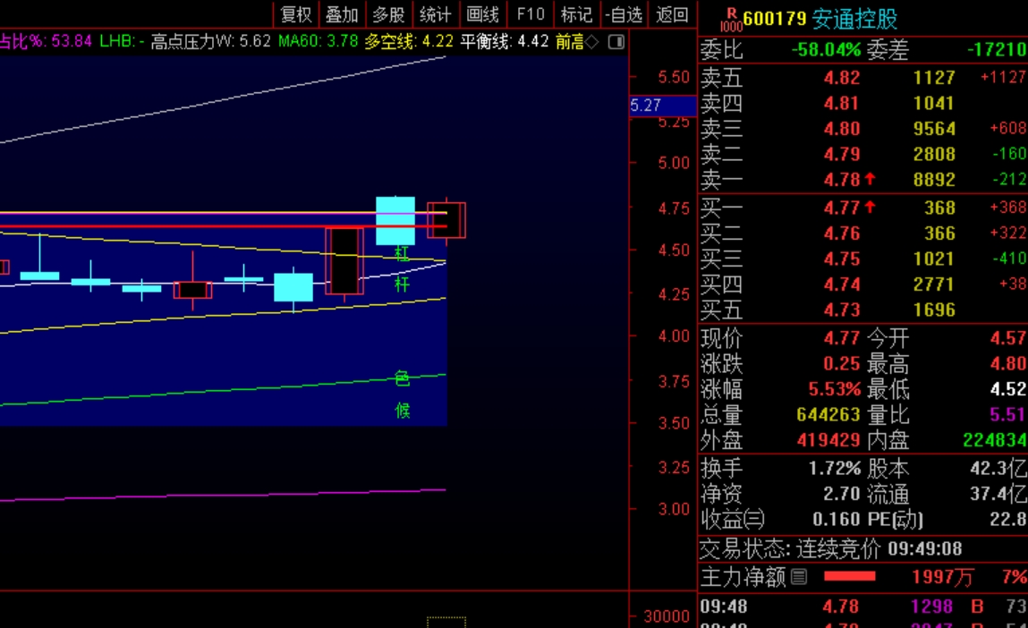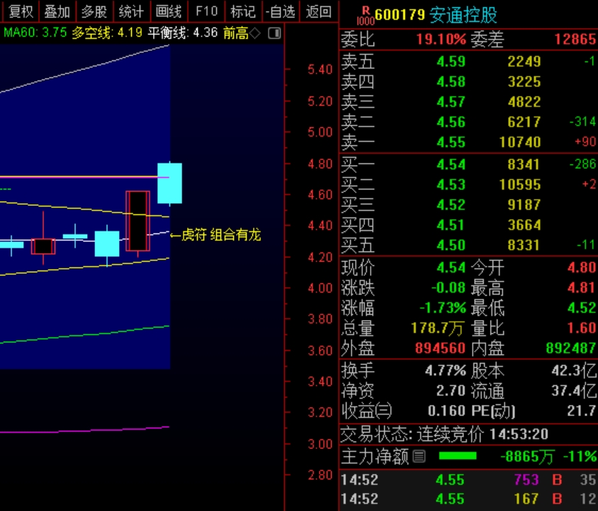 $安通控股(SH600179)$ 安通控股今天高开符合预警信号,严格的来说,介入的位置在开盘价及开盘价以下,注意分笔操作,第一笔在开盘后向下打压的瞬间,第二笔放在平衡线附近,实盘中第一笔,第二笔拉开距离。