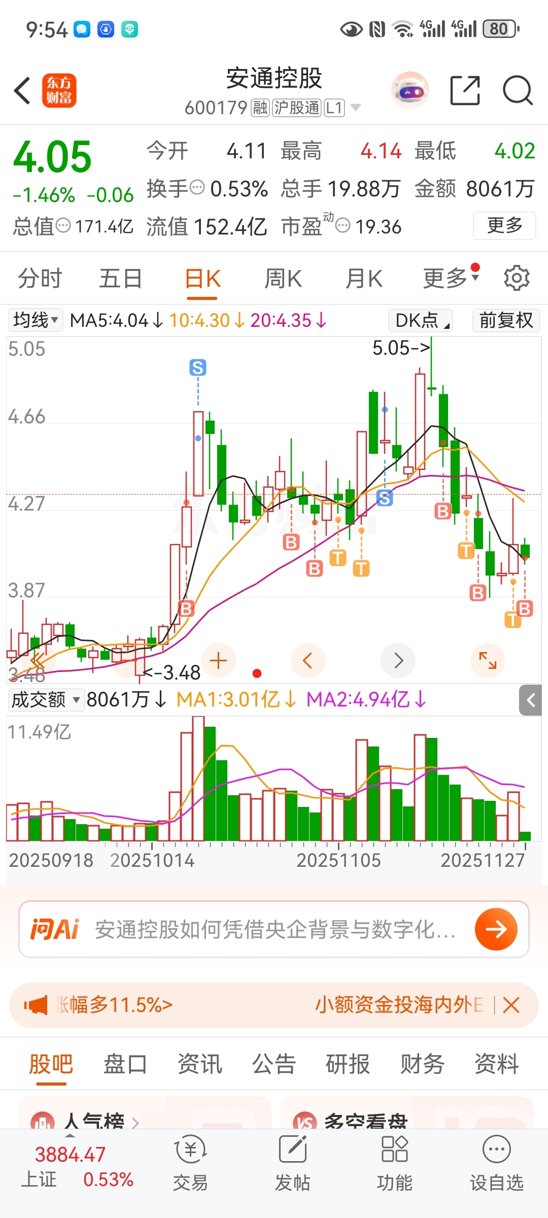 $安通控股(SH600179)$ 4.05又加了3000股,不看了