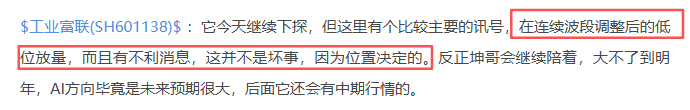 工业富联601138:它今日低开震荡的走势。它这个位置还需要震荡换换手,整体还是波段筑底的阶段中,适当多些耐心,前面的调整已经很充分了。中期角度是没问题的,还会反复走强。工业富联,坤哥已经坚守好几个月了,前面纯低位挖掘的,结果相当不错了。