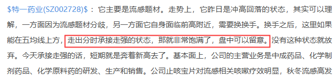 特一药业002728:它今天震荡为主。盘中下探动能不足,下探后明显是有承接力量的,那么还能继续看看短期。今日缩量震荡,属于变盘讯号,继续看看明天能否企稳的阳线。特一药业,是坤哥上周四早文挖掘的,当时讲了它前一日冲高回落,如果还能分时承接住,状态就非常饱满了,盘中可以考虑。当时讲的非常明确了。实际上,上周四早盘分时承接住了,参宇后如期张停。上周五早盘减半了。