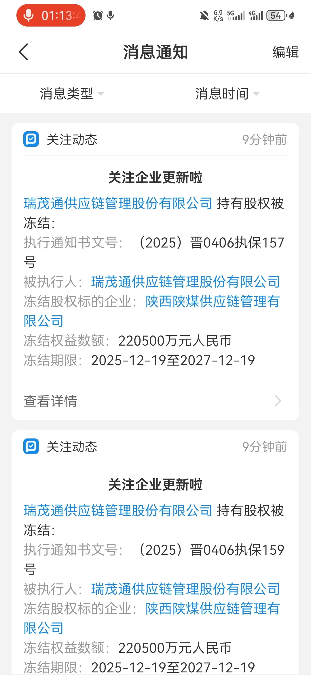 $瑞茂通(SH600180)$ 今天又有股权被冻结啦!