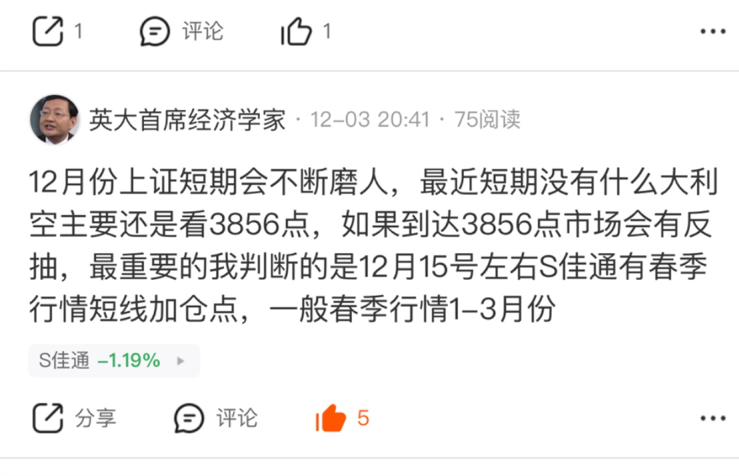 $S佳通(SH600182)$ 12月份上证短期会不断磨人,最近短期没有什么大利空主要还是看3856点,如果到达3856点市场会有反抽,最重要的我判断的是12月15号左右S佳通有春季行情短线加仓点,一般春季行情1-3月份,切记现在不要着急加仓