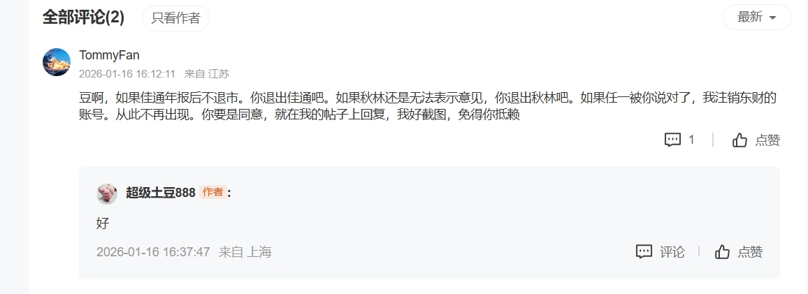 $S佳通(SH600182)$ $秋林3(SZ400101)$ $工新5(SZ400100)$ 豆啊,既然你答应了,我就截图保存了。我给我自己加约束条件,2026年4月年报日,佳通是无保留审计意见,且不会退市,且秋林是无法表示意见。如果任一一条不对,我注销东财账户。