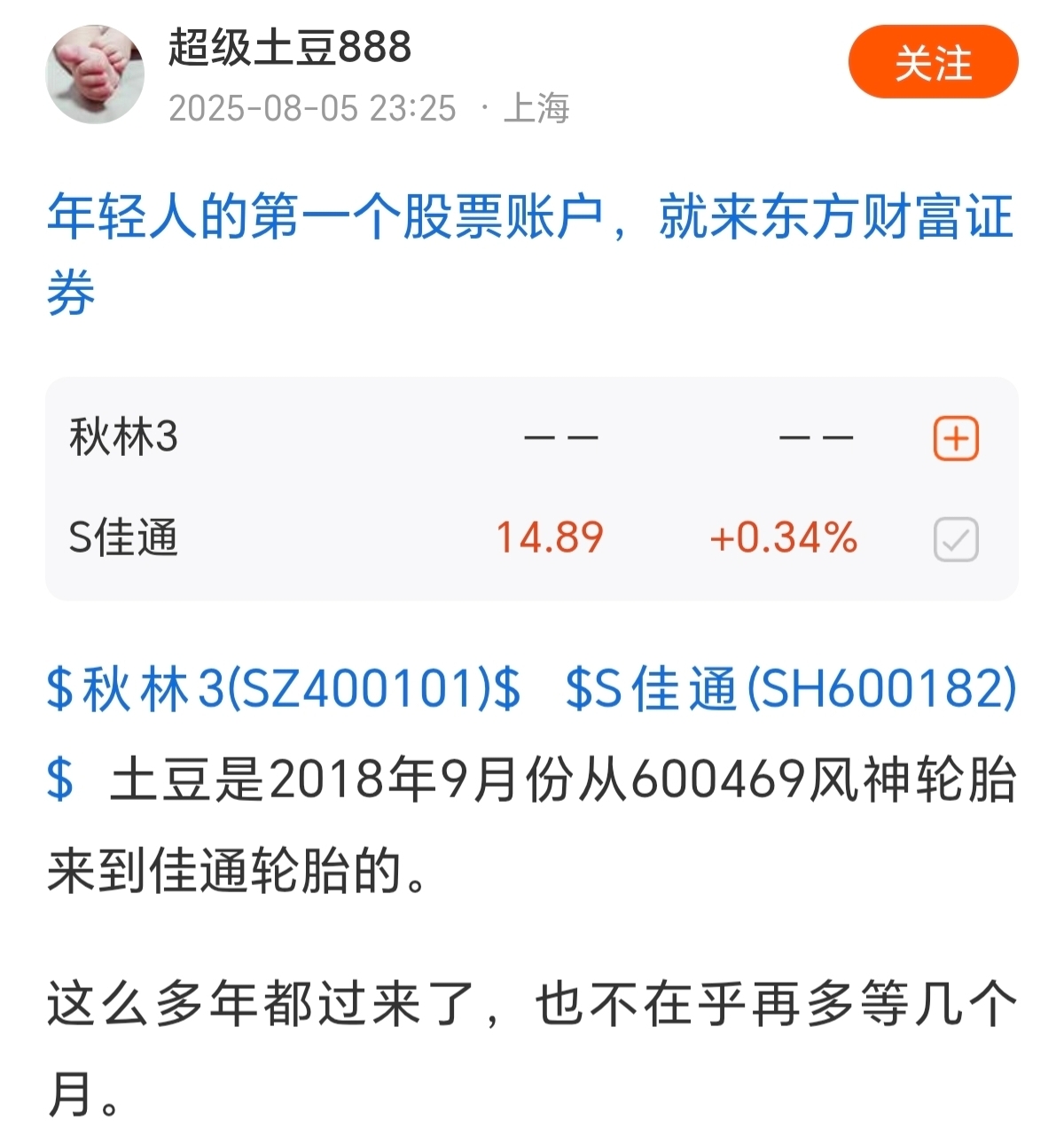 $S佳通(SH600182)$ $秋林3(SZ400101)$ 豆啊,你看你又急,你从什么轮胎来,到秋林,和佳通有什么关系。我搜索关键字,又让我发现了乐子。这种言论去年也发过多次吧。去年说不在乎多等几个月,今年又是不在乎多等几个月,明年是不是又不在乎在等?