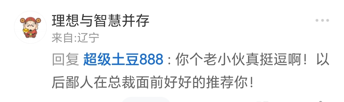 $S佳通(SH600182)$ $秋林3(SZ400101)$ $柏龙3(SZ400204)$ 每天图一乐,今天来看土豆另一个小号东北虎在东北的言论。该号现改名理想与智慧并存。话风试图从东北虎75岁老股民人设改成专业做三板股票的成功人士人设