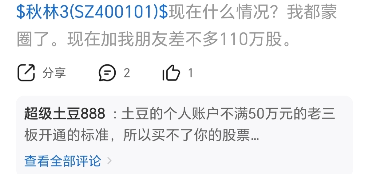 $S佳通(SH600182)$ $秋林3(SZ400101)$ $工新5(SZ400100)$ 咱再让土豆面对下现实。什么秋林六万手,土豆团都是臆想的。一块八收秋林收了几年了,春节期间遇到一个真有80万股秋林的,就开始支支吾吾了。