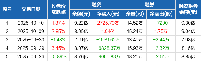 生益科技:融资净买入2725.79万元,融资余额9.22亿元(10-10)