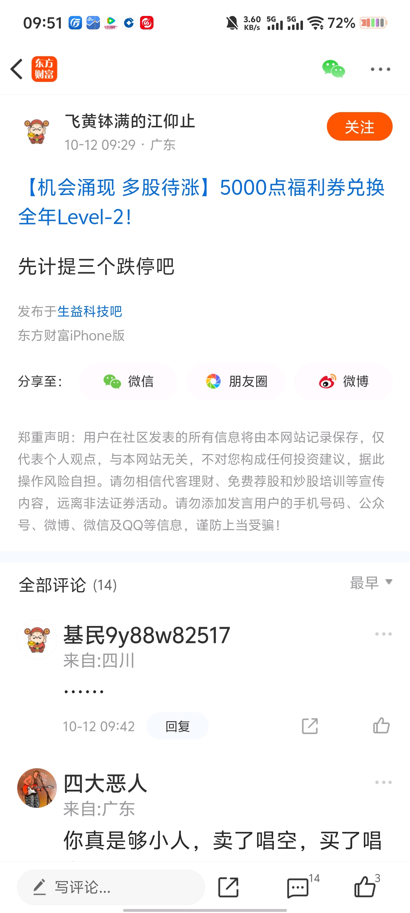 温馨提示: 1.根据《证券法》规定,禁止编造、传播虚假信息或者误导性信息,扰乱证券市场;2.用户在本社区发表的所有资料、言论等仅代表个人观点,与本网站立场无关,不对您构成任何投资建议。用户应基于自己的独立判断,自行决定证券投资并承担相应风险。《东方财富社区管理规定》