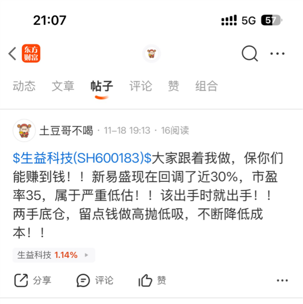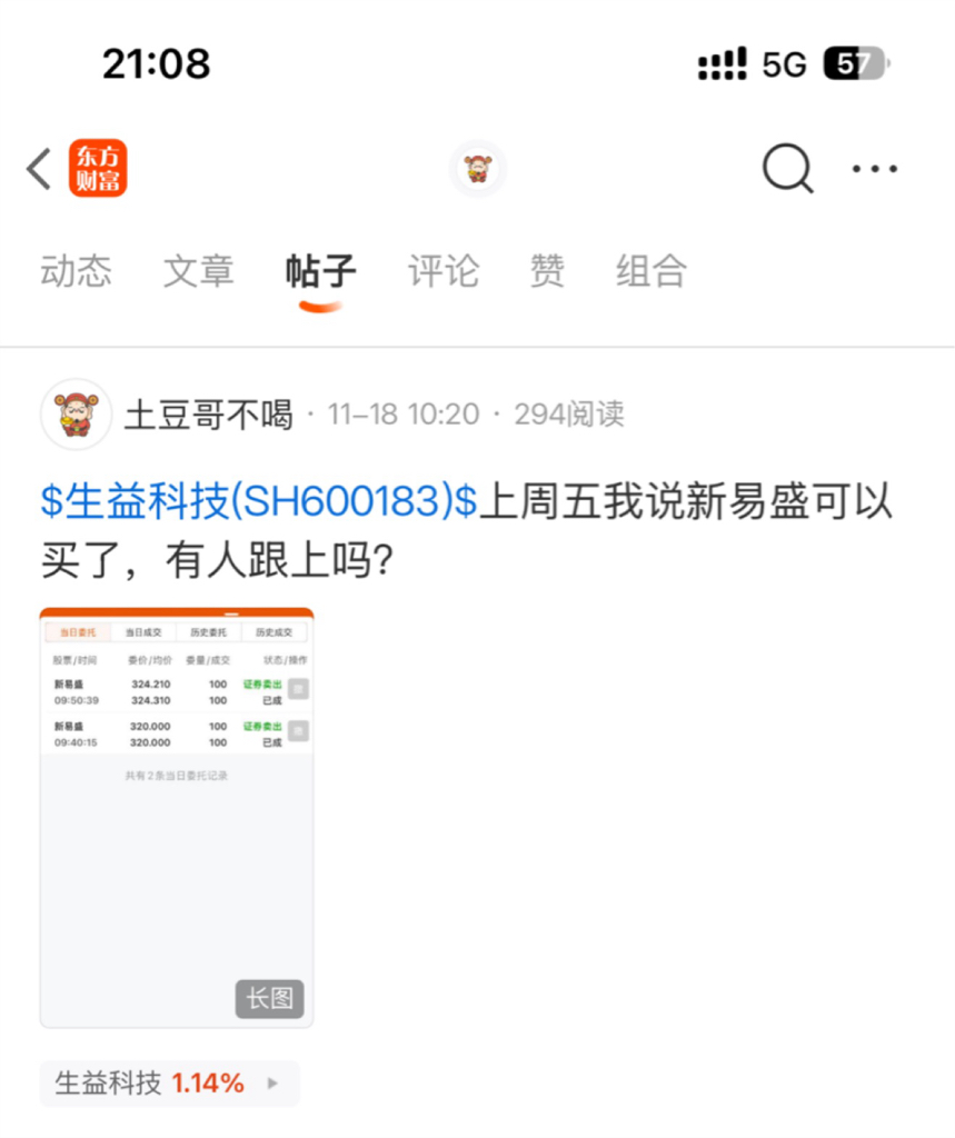 $生益科技(SH600183)$ 我在11.18就说清仓去买新易盛,新易盛属于低估!!可能有人去买了,也可能有人看我笑话!!我自己56.5卖了生益科技一大部分,买了新易盛!!目前新易盛盈利30个点,这一波吃到的肉不比在生益科技高吗?我只是一个散户,只是发表个人意见,个别人不要到处乱喷!!不愿意看你拉黑我就好!!