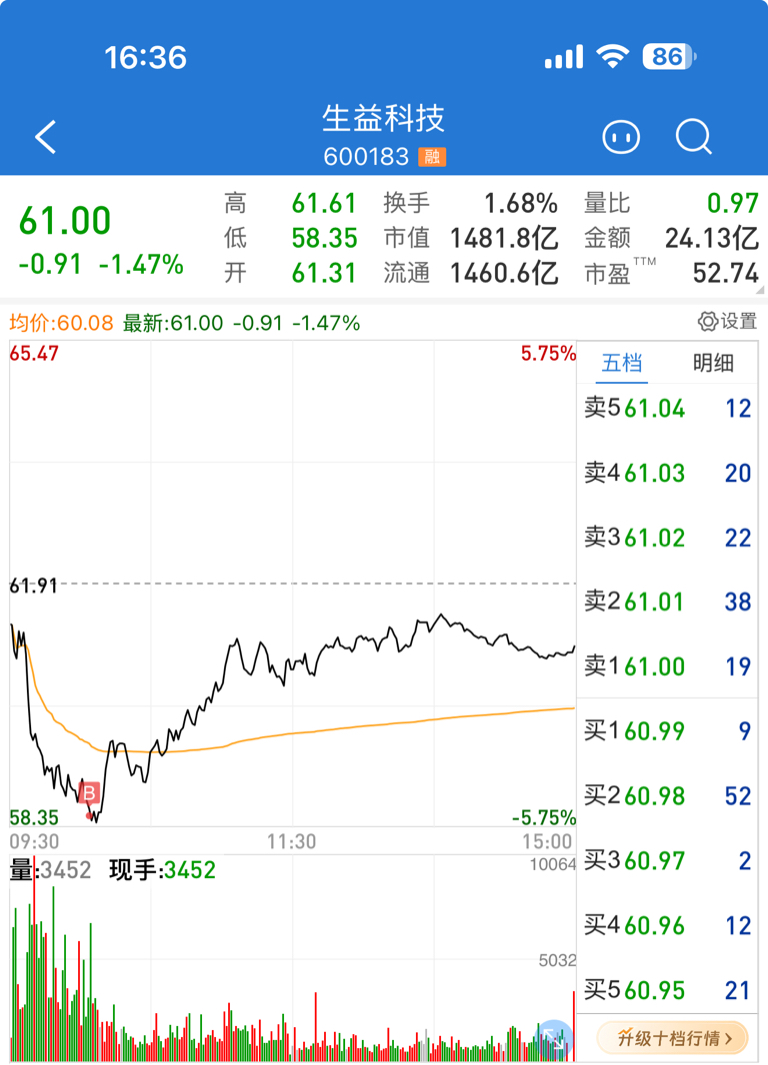 $生益科技(SH600183)$ 昨天62.2 出一半,今天抄底回来。