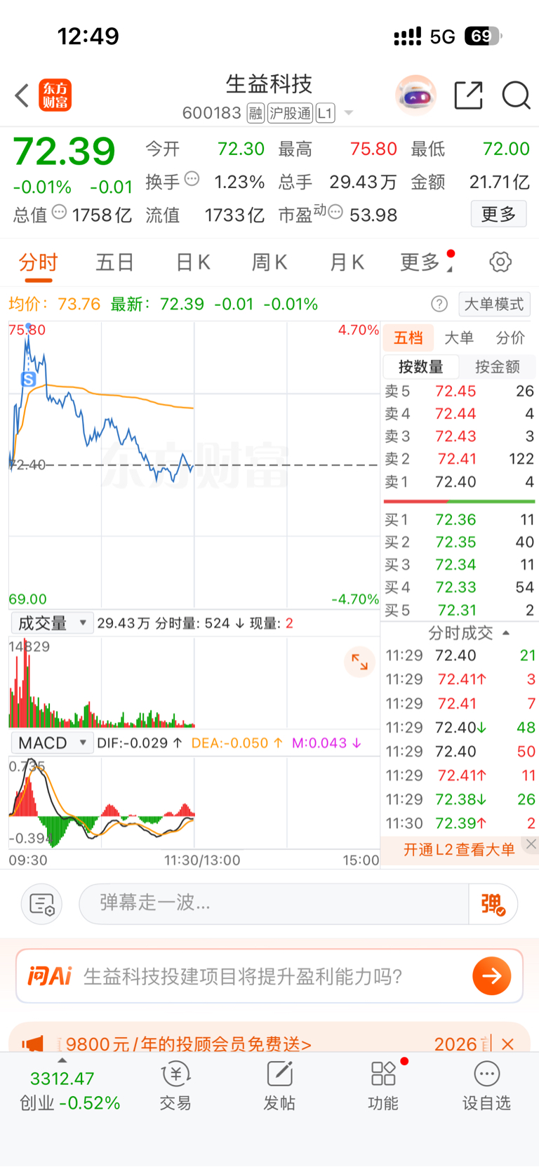$生益科技(SH600183)$ 高抛低吸,下午跌到70再加!!