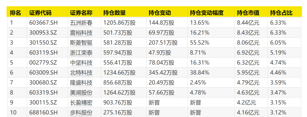 深南电路、阳光电源、浪潮信息、东山精密新晋十大重仓股之列。