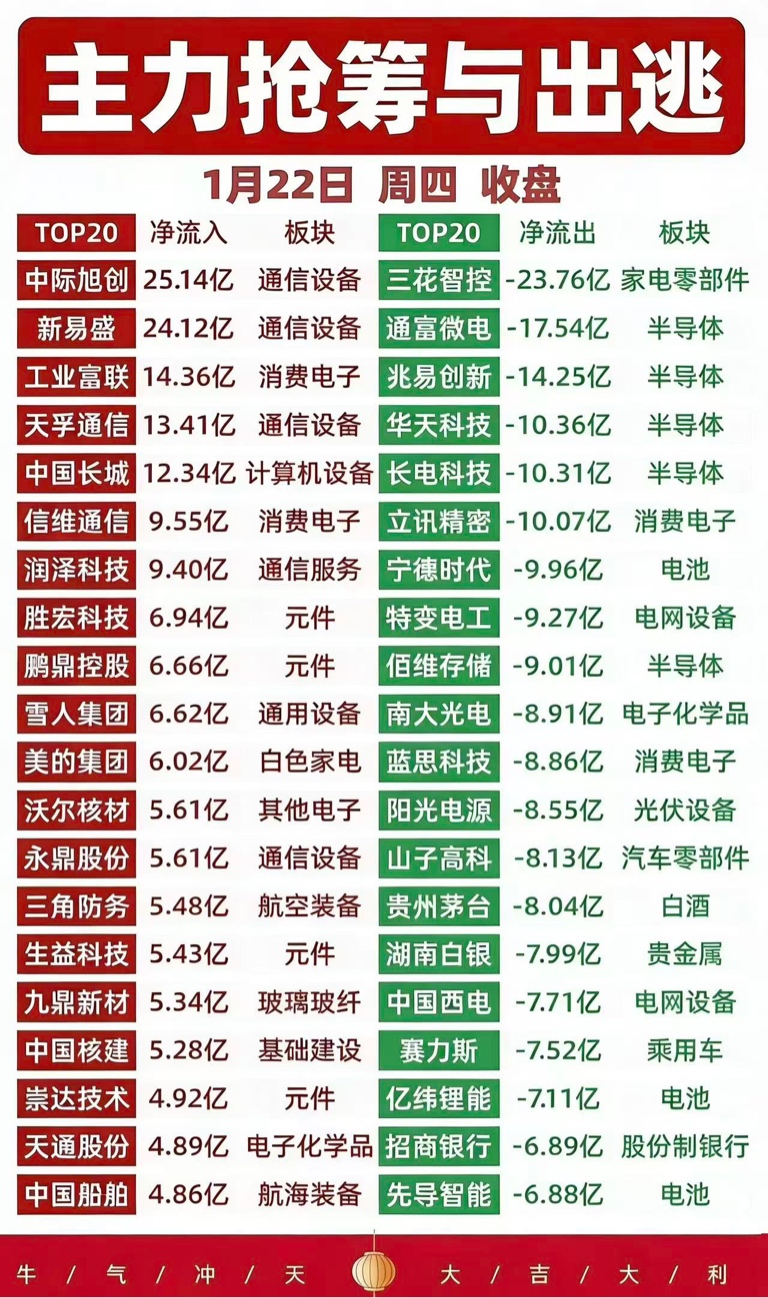 1.中际旭创:通信设备龙头,今日获25.14亿主力资金抢筹。受益于全球算力需求爆发及800G光模块持续放量,公司业绩增长确定性较强,资金大幅流入彰显对其行业地位与成长前景的认可。