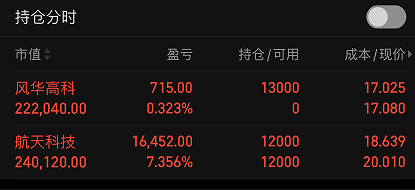风华高科:昨天制定的计划是在15日均线附近低西入场,今天早盘最低打到16.95止跌企稳,盘中用沙盘推演了下,明天5日均线将上行到17,股价短期往下空间有限,中期上涨趋势已经形成,上午在17附近先入场了。