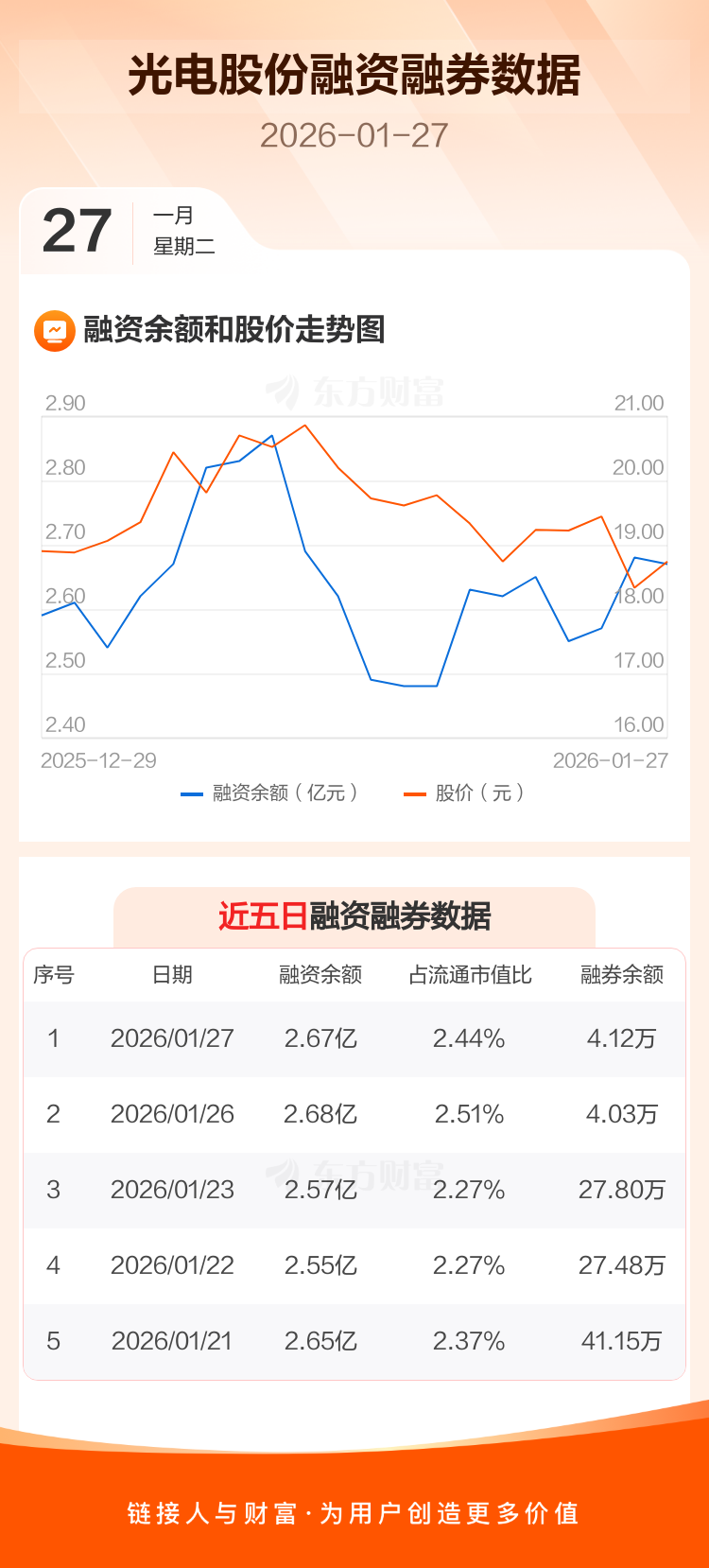 交易所最新数据显示,光电股份于2026年1月27日获融资买入2398.40万元,融资偿还2508.85万元,当日融资净偿还110.45万元。目前,该股融资余额2.67亿,占流通市值比例为2.44%。