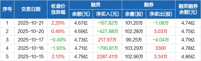 融资方面,当日融资买入1814.22万元,融资偿还2012.04万元,融资净偿还197.82万元。融券方面,融券卖出4300股,融券偿还1.51万股,融券余量101.2万股,融券余额632.5万元。融资融券余额合计4.74亿元。