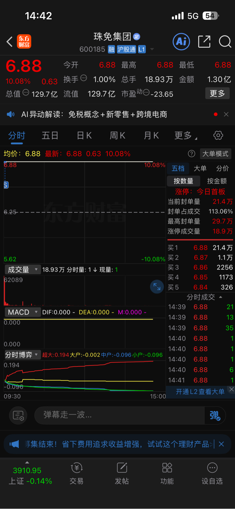 $珠免集团(SH600185)$ 全部卖了,虽然还会连板,祝大家暴富