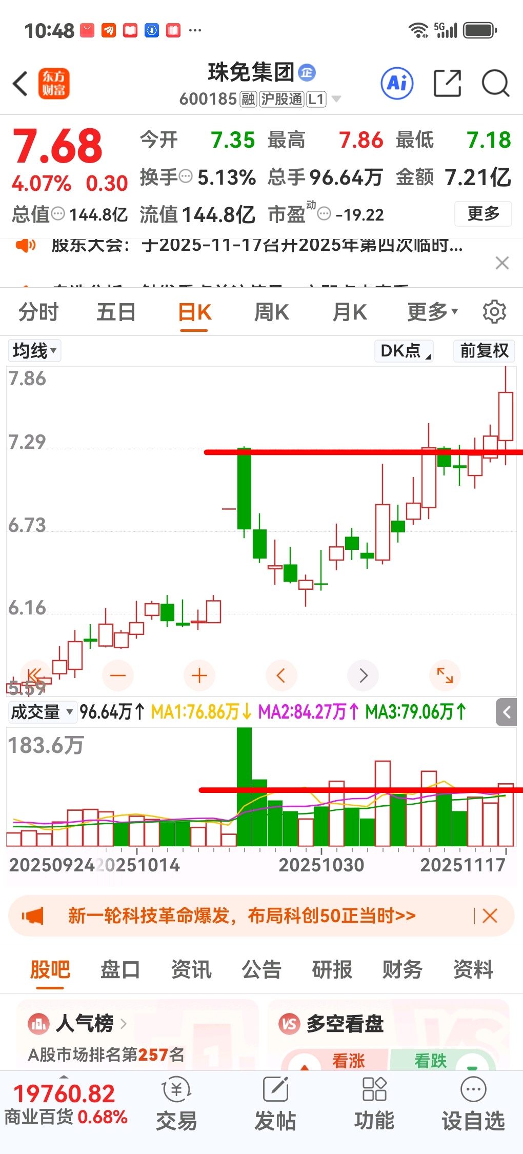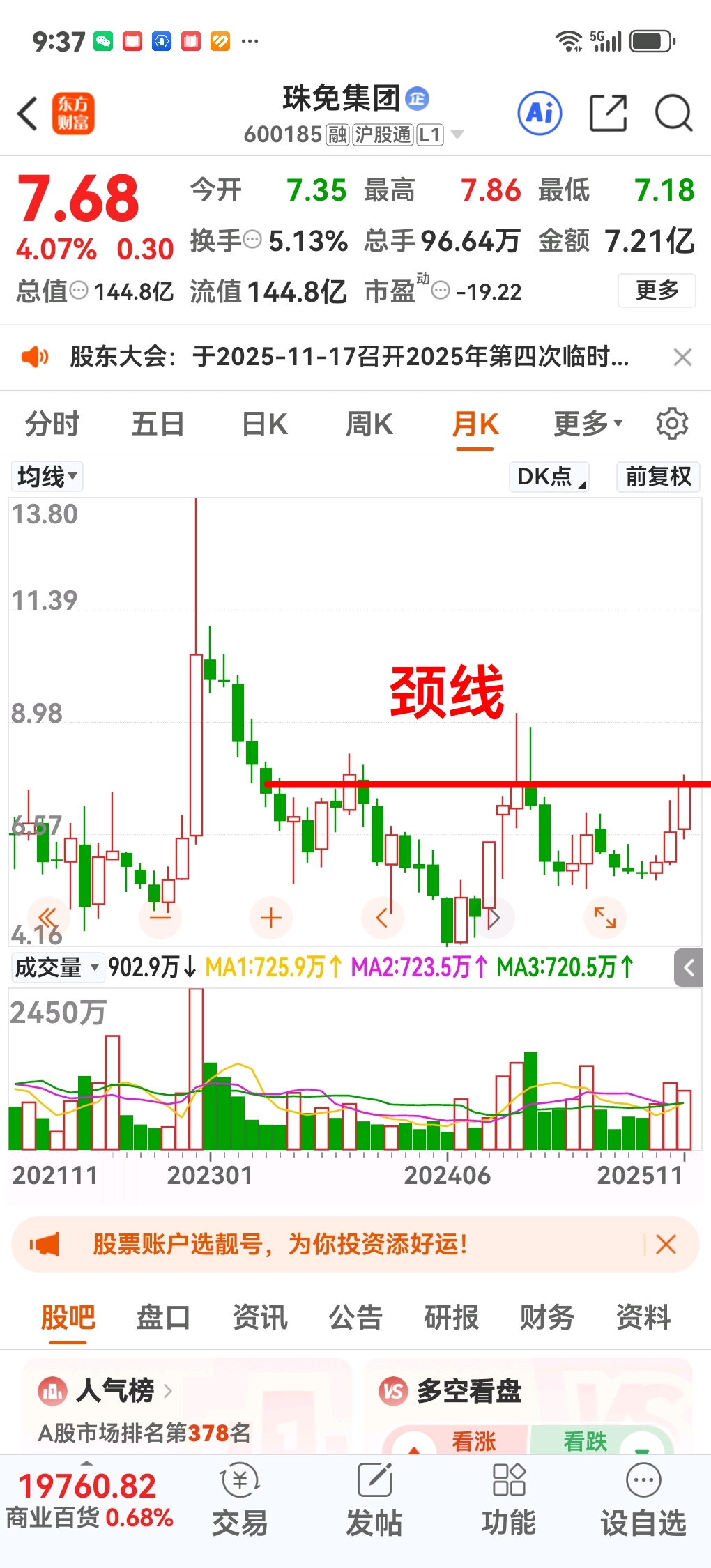 $珠免集团(SH600185)$ 珠免集团,山鸡变凤凰,日线看,主力前期用了江湖中较为凶悍的天量大阴线洗盘甩开浮筹,月线技术面正在构筑复合头肩底的右肩,根据公式,先保守看7.5+(9-4)=12.5大元