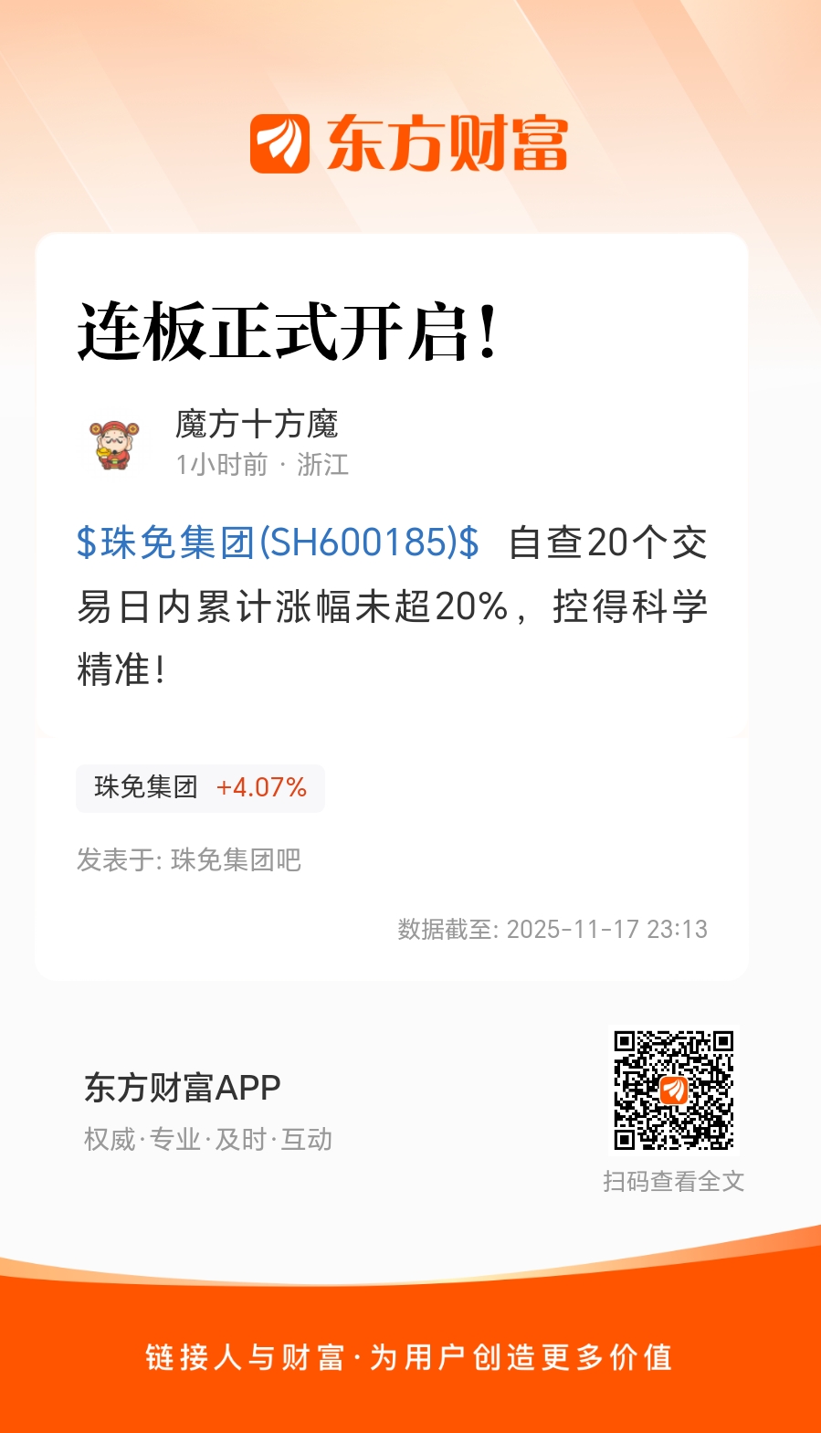 $珠免集团(SH600185)$  自查20个交易日内累计涨幅未超20%,控得科学精准!