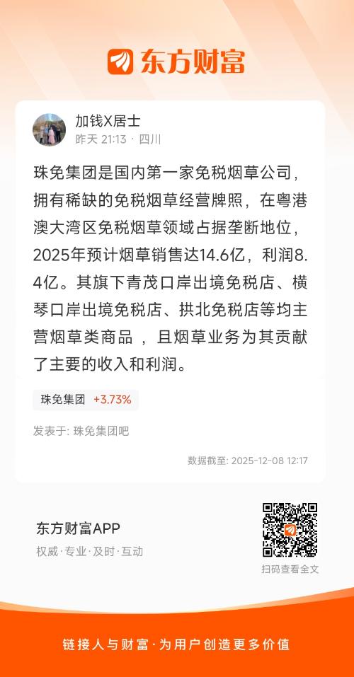珠免集团是国内第一家免税烟草公司,拥有稀缺的免税烟草经营牌照,在粤港澳大湾区免税烟草领域占据垄断地位,2025年预计烟草销售达14.6亿,利润8.4亿。其旗下青茂口岸出境免税店、横琴口岸出境免税店、拱北免税店等均主营烟草类商品 ,且烟草业务为其贡献了主要的收入和利润。