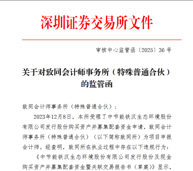 深交所近日关于对致同会计师事务所(特殊普通合伙)的监管函,对致同会计师事务所(特殊普通合伙)采取书面警示自律监管措施。