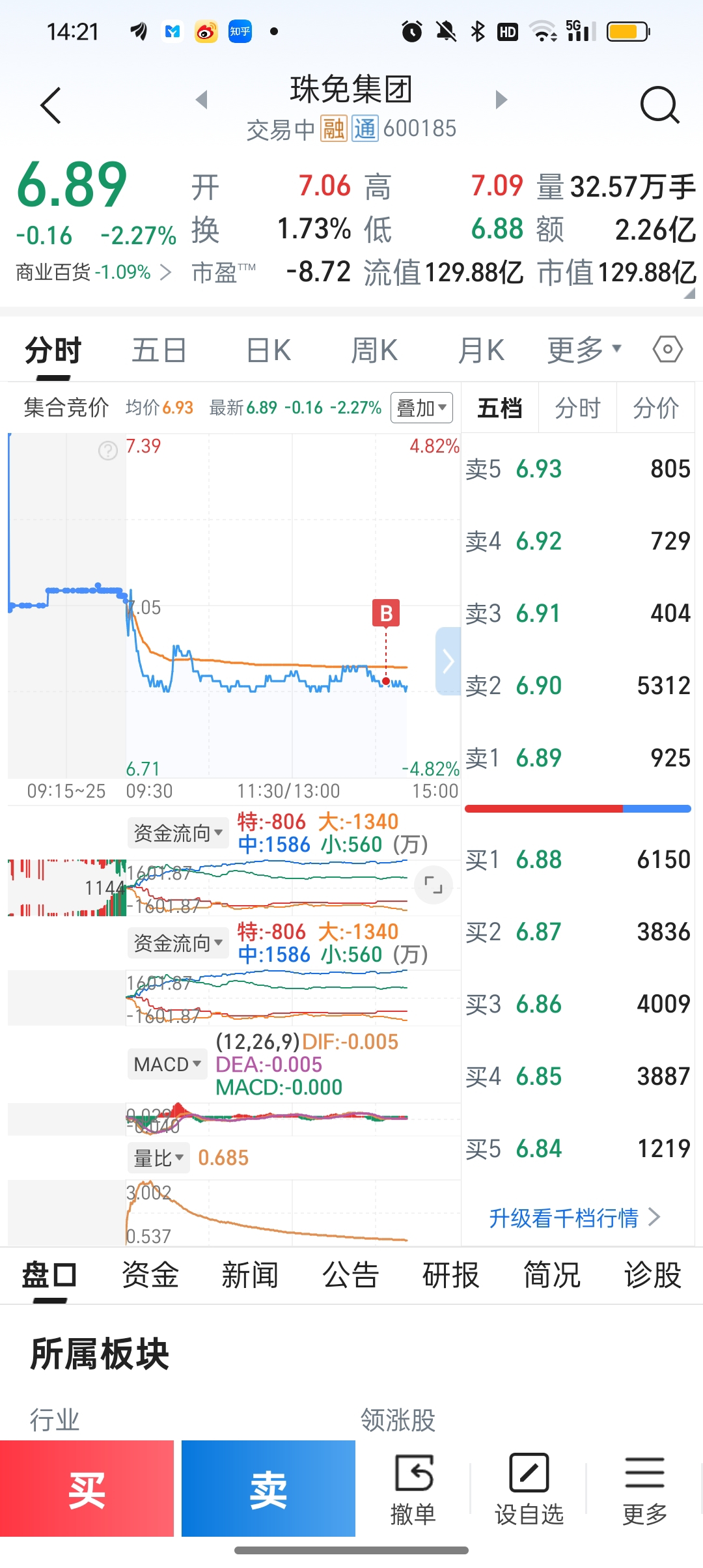 $珠免集团(SH600185)$ 7元以下的价格,我只是买入。