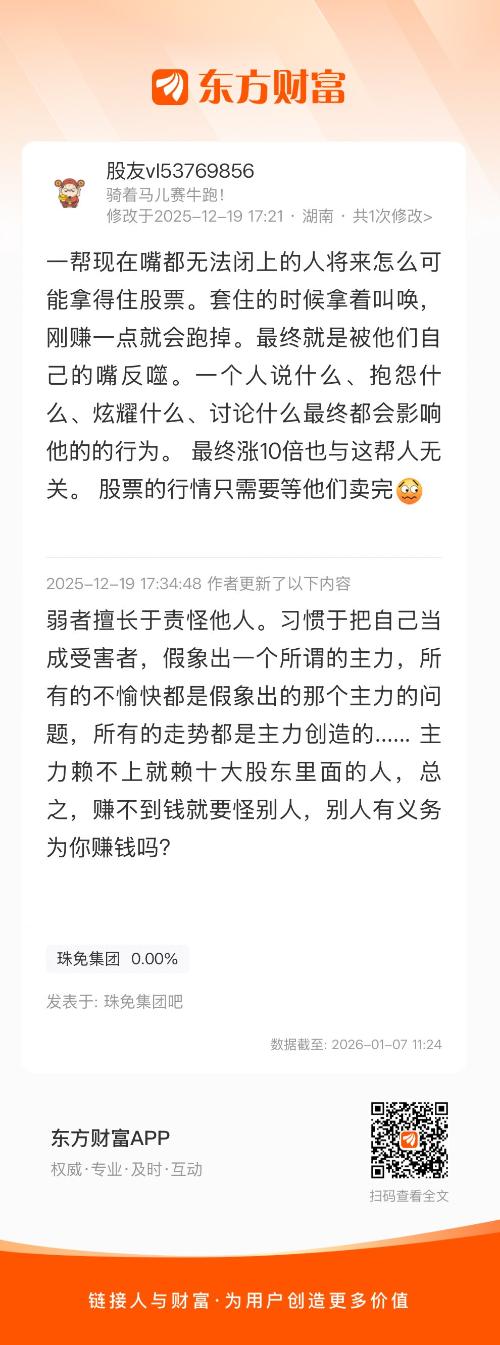 一帮现在嘴都无法闭上的人将来怎么可能拿得住股票。套住的时候拿着叫唤,刚赚一点就会跑掉。最终就是被他们自己的嘴反噬。一个人说什么、抱怨什么、炫耀什么、讨论什么最终都会影响他的的行为。 最终涨10倍也与这帮人无关。 股票的行情只需要等他们卖完