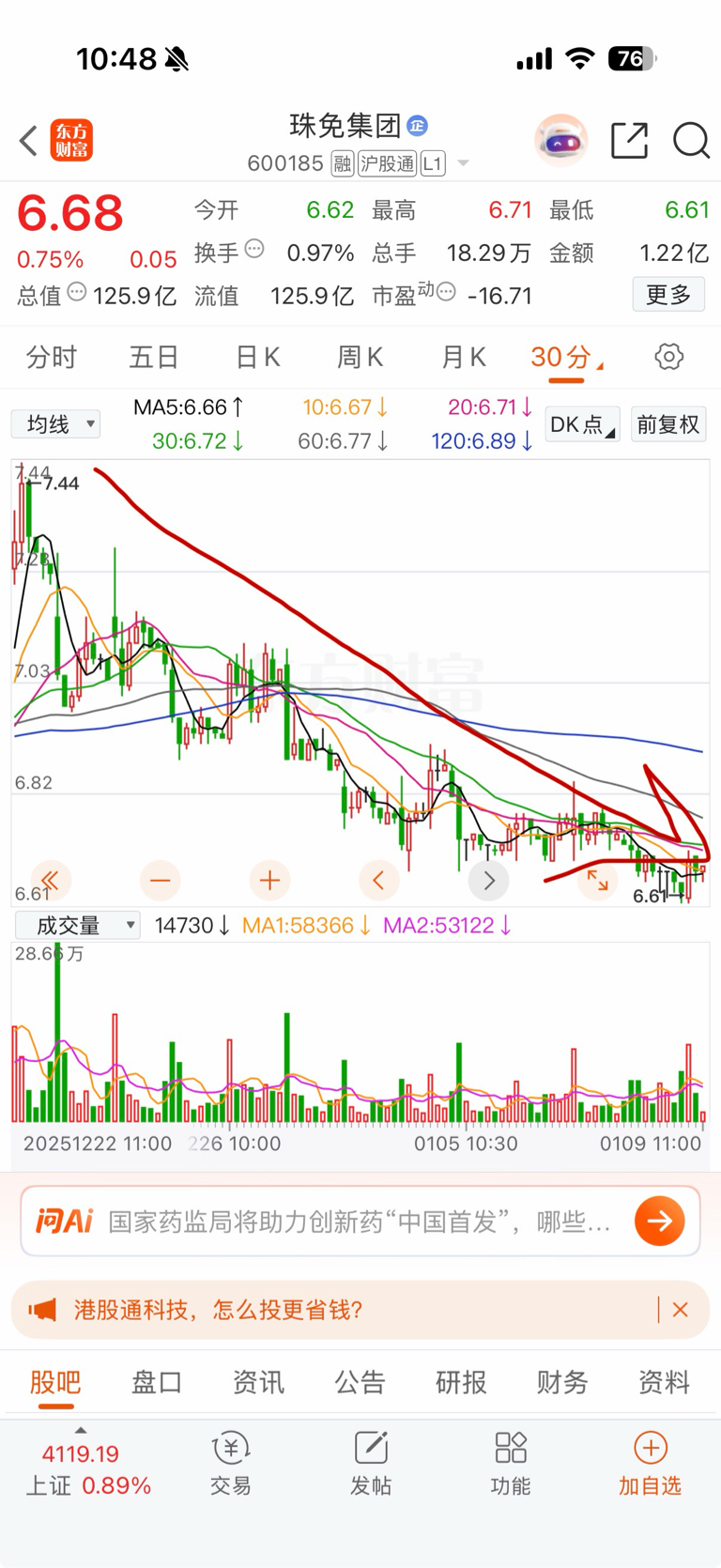 $珠免集团(SH600185)$ 单边下行没有反转信号