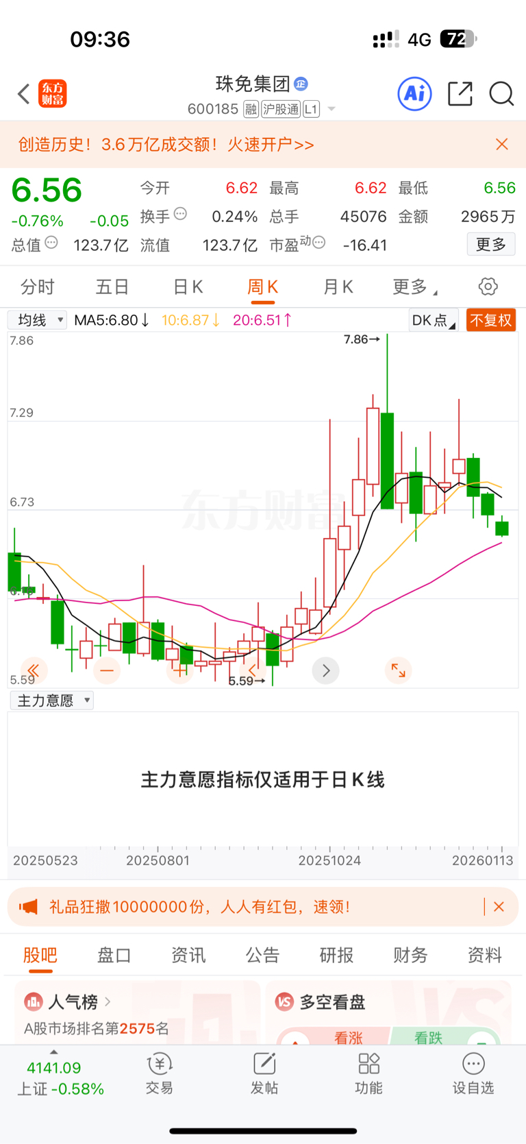 $珠免集团(SH600185)$ 周线上马上跌到20日均线了!这是底部!加仓猛干!