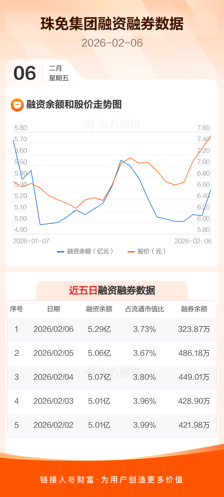 交易所最新数据显示,珠免集团于2026年2月6日获融资买入7087.14万元,融资偿还4758.34万元,当日融资净买入2328.8万元。目前,该股融资余额5.29亿,占流通市值比例为3.73%。