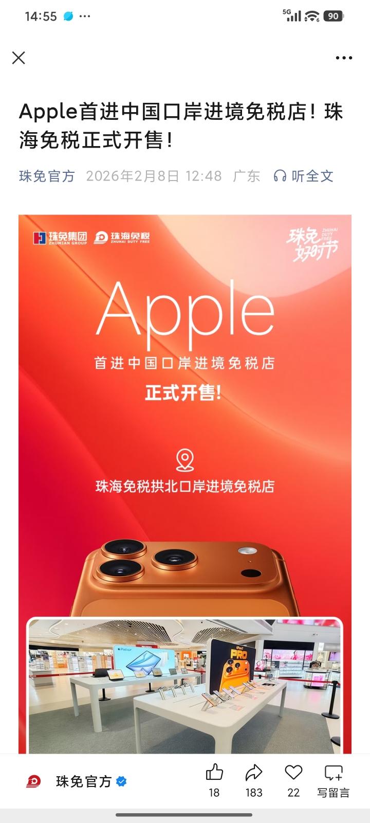 Apple首进中国口岸进境免税店!珠海免税正式开售!