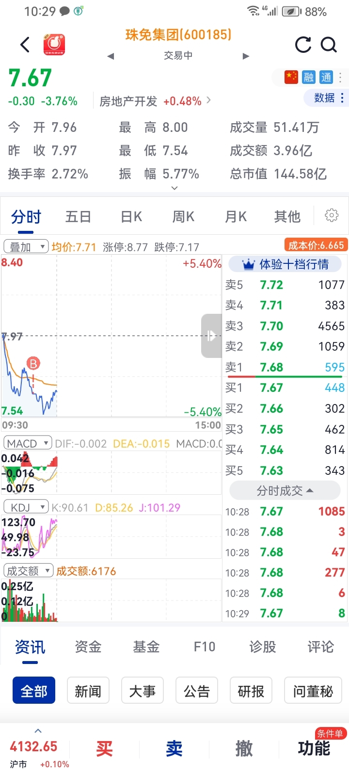 $珠免集团(SH600185)$ 加仓太早哦,与低点相差1毛4分。