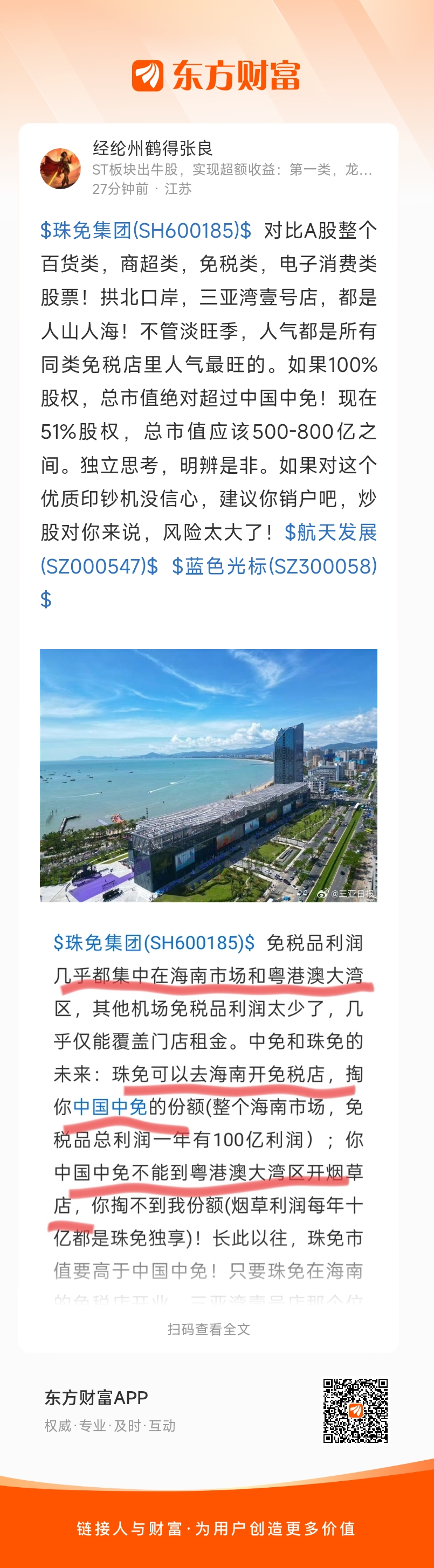 $珠免集团(SH600185)$ 对比A股整个百货类,商超类,免税类,电子消费类股票!拱北口岸,三亚湾壹号店,都是人山人海!不管淡旺季,人气都是所有同类免税店里人气最旺的。如果100%股权,总市值绝对超过中国中免!现在51%股权,总市值应该500-800亿之间。独立思考,明辨是非。如果对这个优质印钞机没信心,建议你销户吧,炒股对你来说,风险太大了!$航天发展(SZ000547)$ $蓝色光标(SZ300058)$