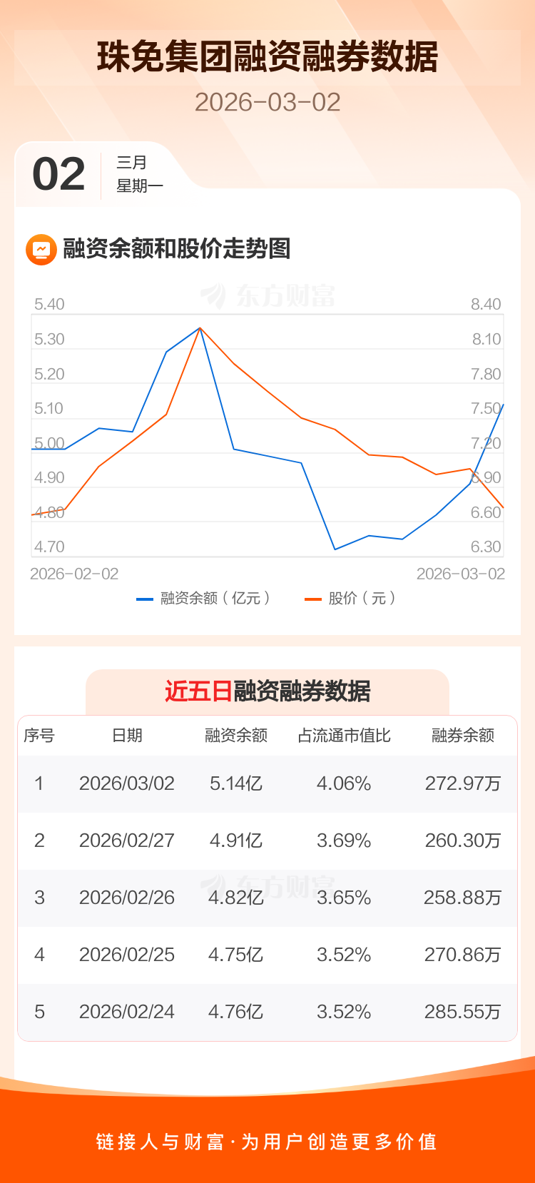 交易所最新数据显示,珠免集团于2026年3月2日获融资买入4602.37万元,融资偿还2333.81万元,当日融资净买入2268.57万元。目前,该股融资余额5.14亿,占流通市值比例为4.06%。