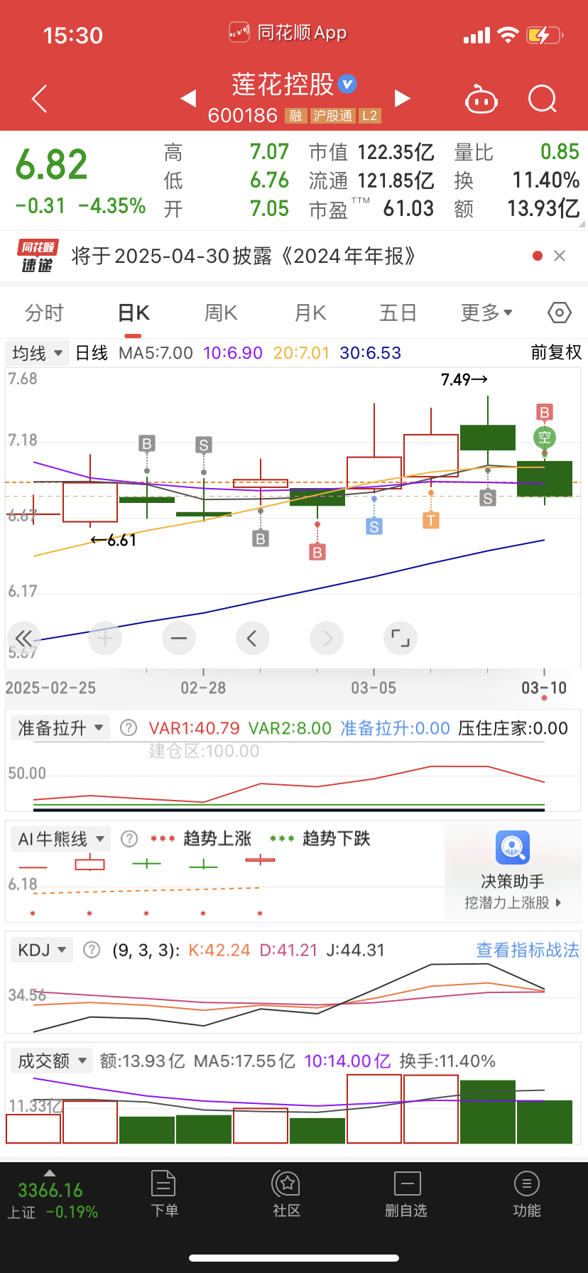 $莲花控股(SH600186)$ 今天又回踩到了买入线,6.60-6.78,我又回来了