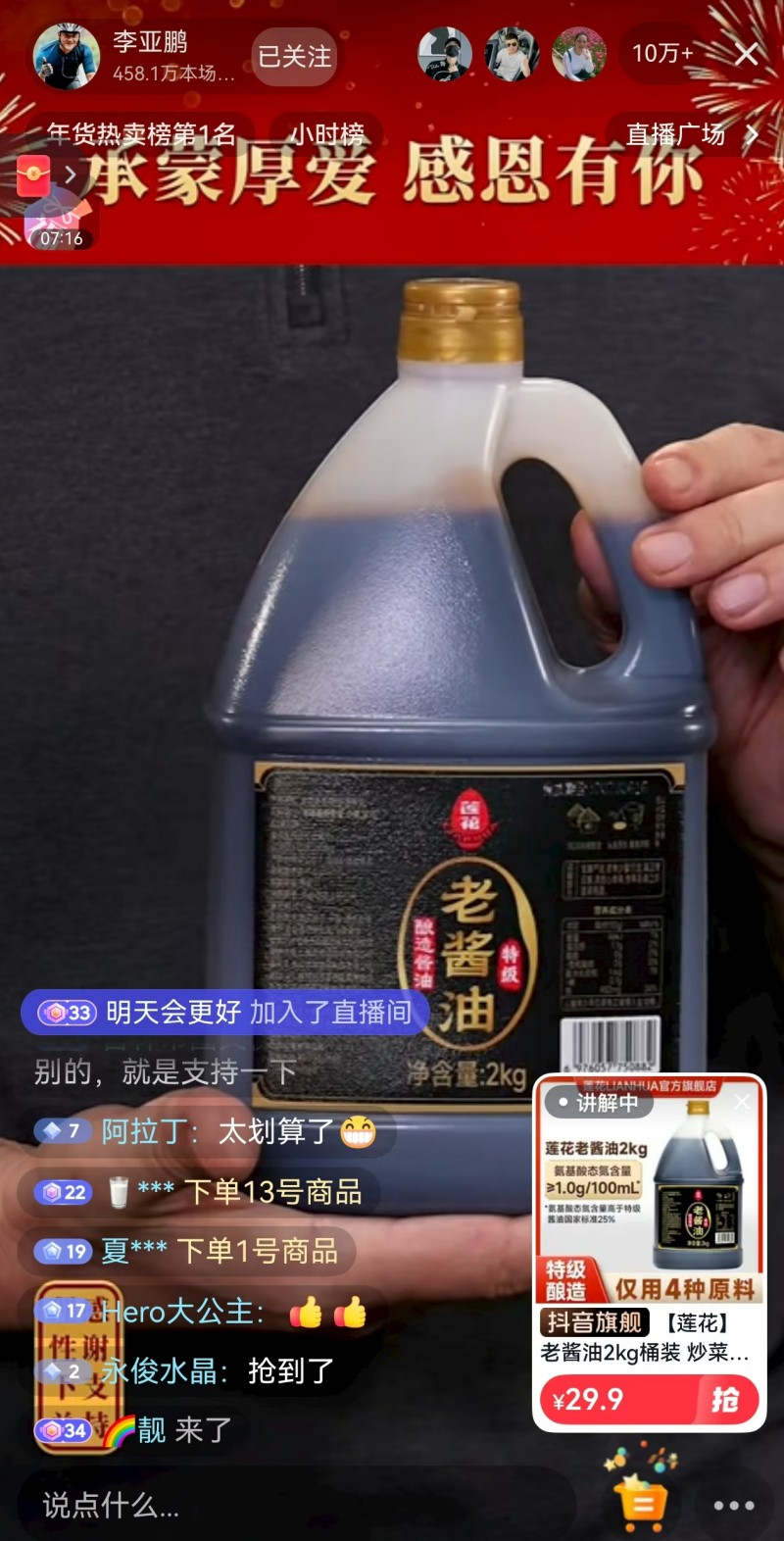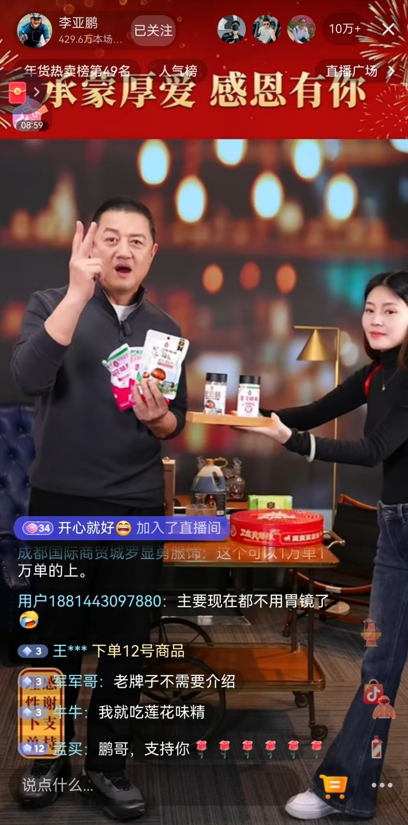 【大河财立方记者史冰倩】2月8日晚间7点,李亚鹏抖音直播间准时开启直播,直播间人气一路飙升,在线观看人数突破10万+,直接登顶抖音年货热卖榜,购物车内莲花味精、卫龙辣条等多款商品链接迅速售罄,直播间抢购氛围拉满。