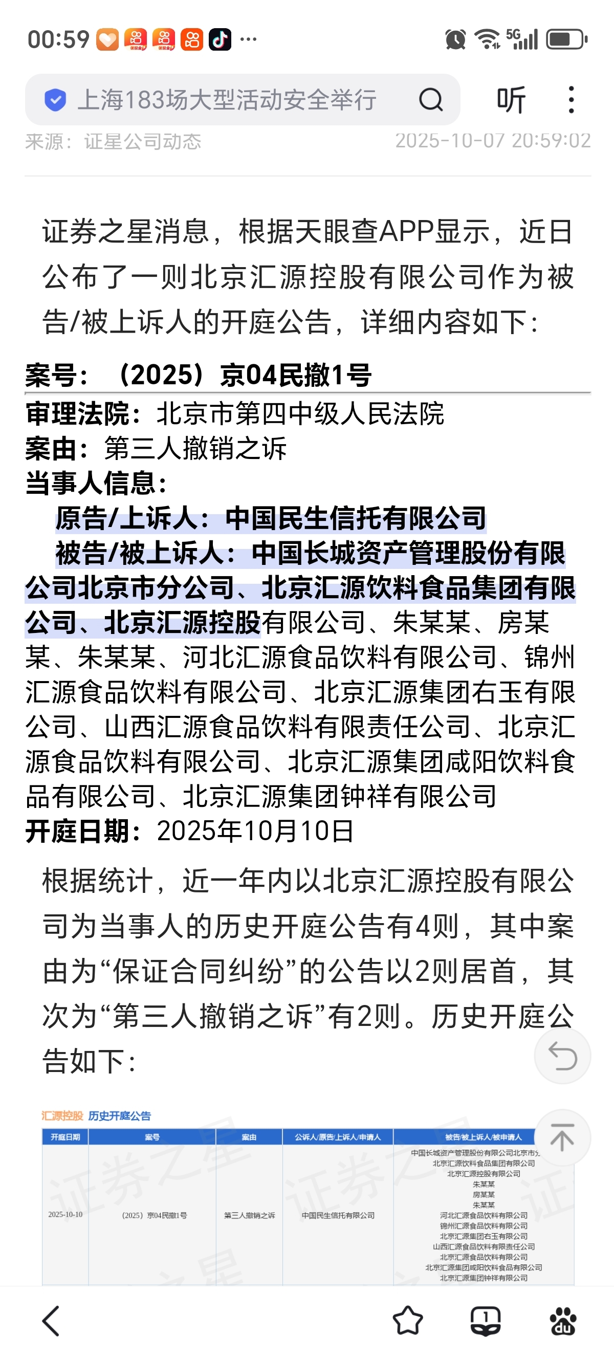 $国中水务(SH600187)$ 谁知道长城信托和老朱今天开庭。 民生是长城信托持有汇源30%股权的担保人。