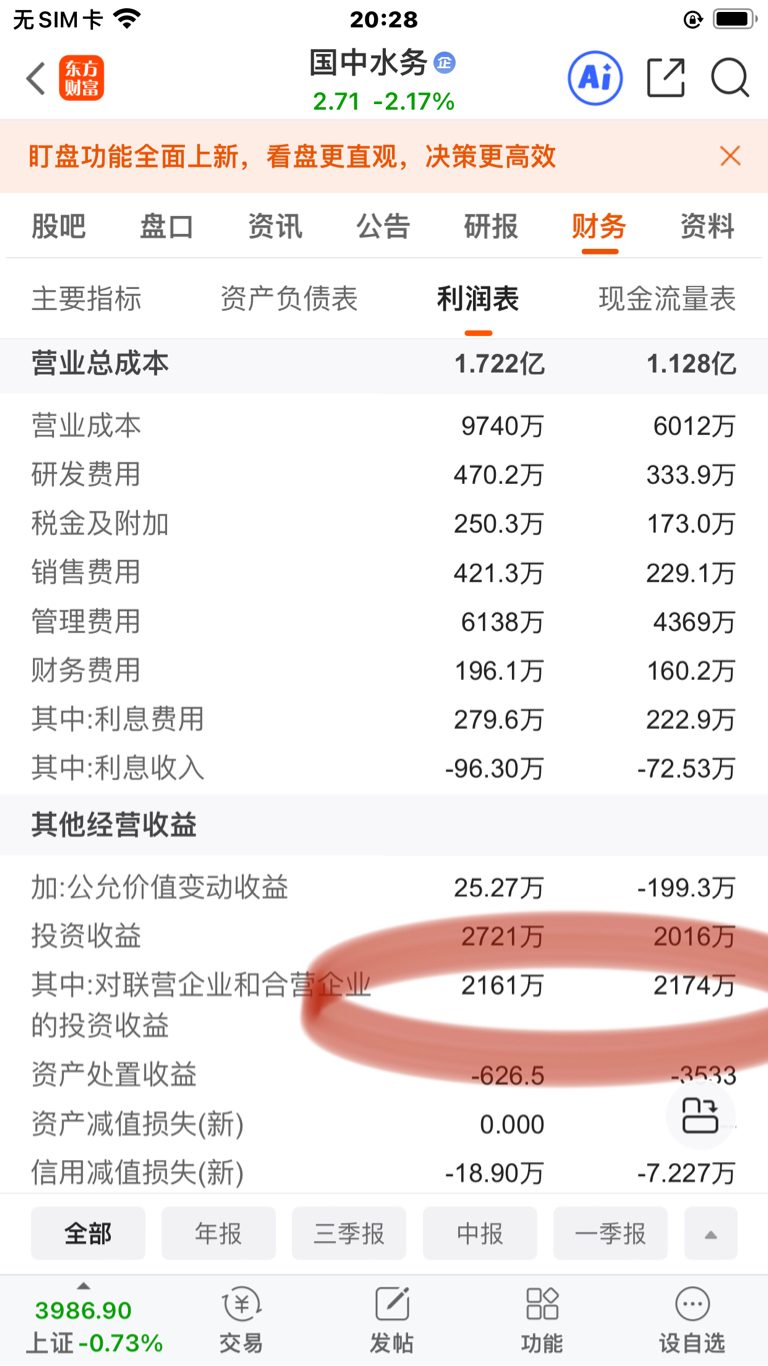 $国中水务(SH600187)$ 三季报并未把汇源果汁投资收益记录 相反与中报相比少了13万 可笑可悲