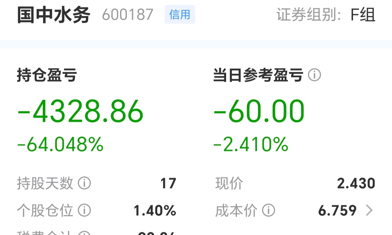 $国中水务(SH600187)$ 跌起来真溜,还好割的早,留一点陪它退市