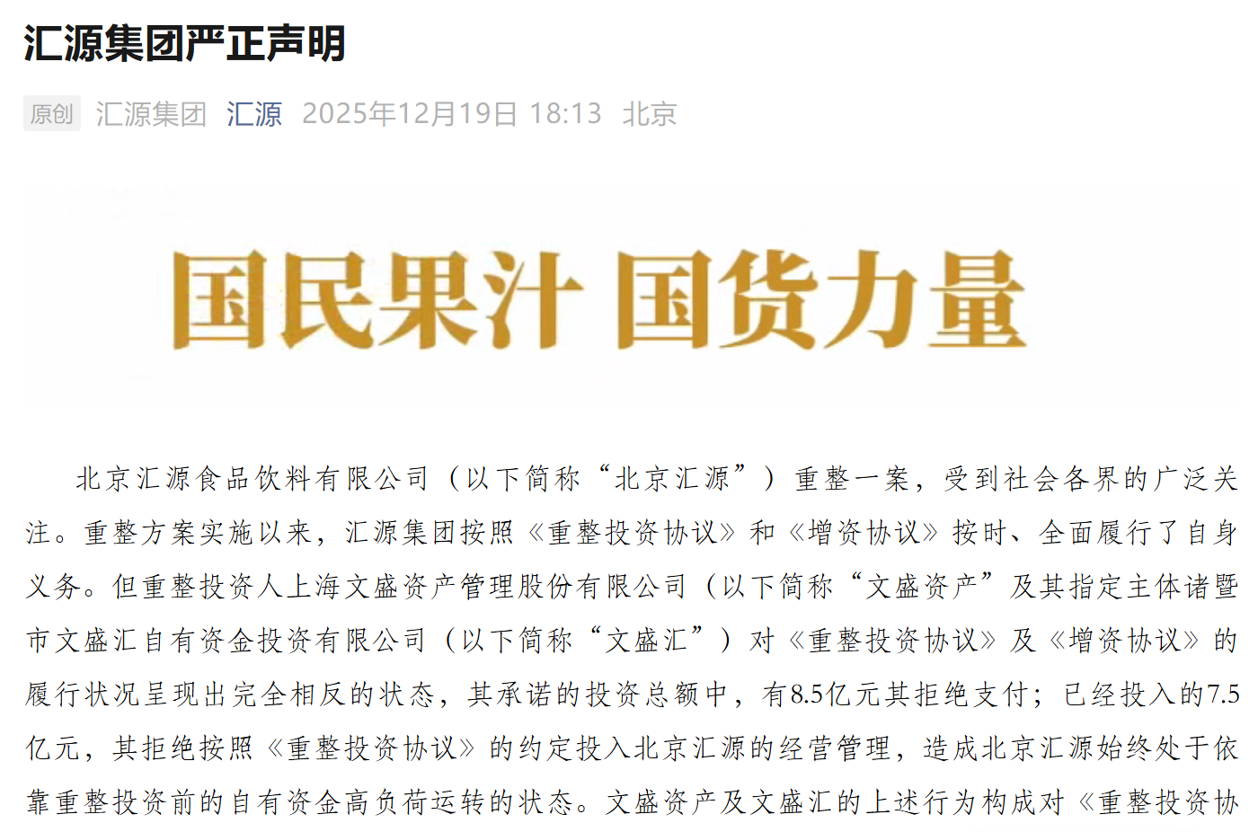 汇源集团在官微表示,自北京汇源重整方案实施以来,公司已按《重整投资协议》和《增资协议》全面履行自身义务,但文盛资产及文盛资产指定主体文盛汇的履约状态完全相反。