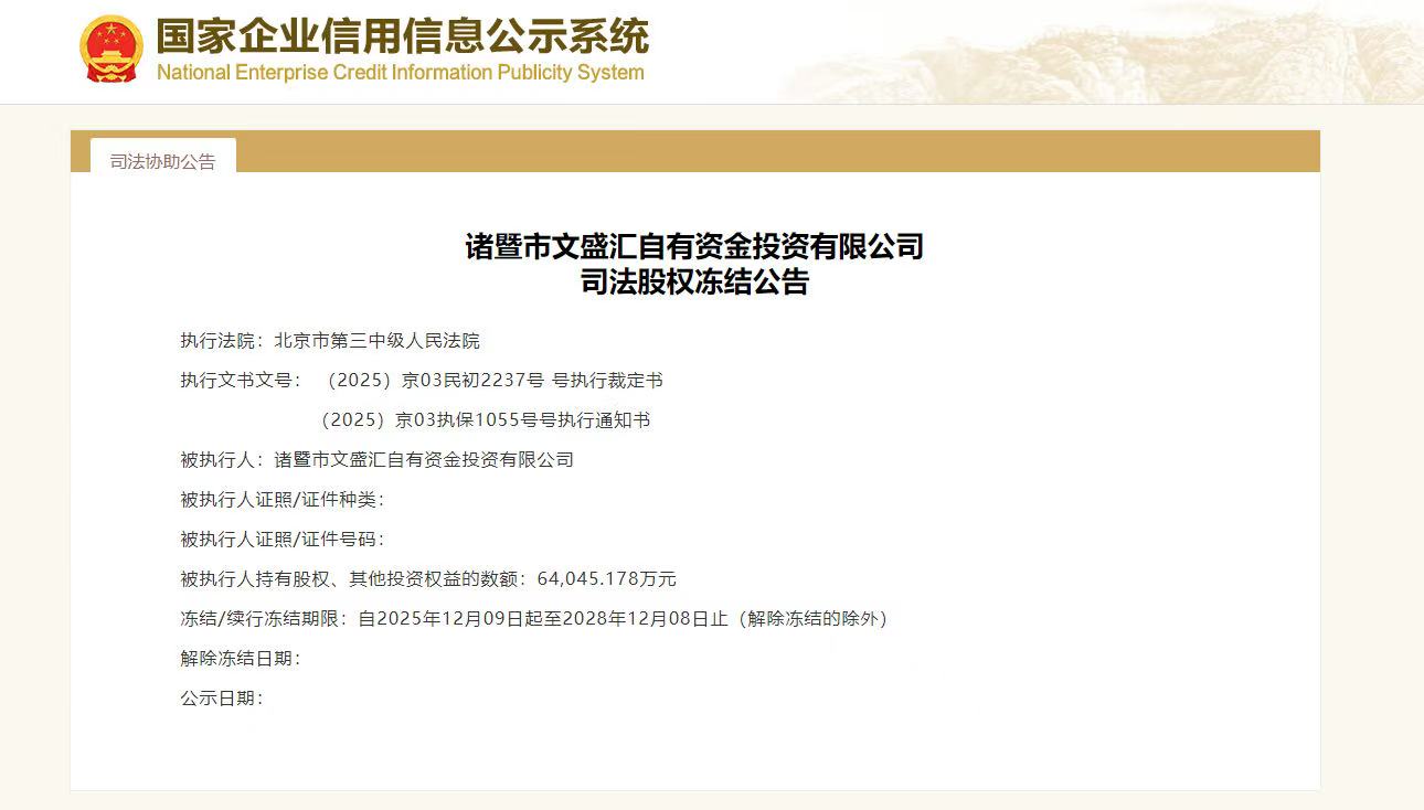 时代周报记者从国家企业信用信息公示系统查询得知,诸暨市文盛汇自有资金投资有限公司(以下简称“文盛汇”)持有的北京汇源股权已经被北京市第三中级人民法院司法冻结。一般而言,被冻结的股权不能买卖、不能转让、不能质押、不能私下处置,也不能通过股权进行任何资本活动。