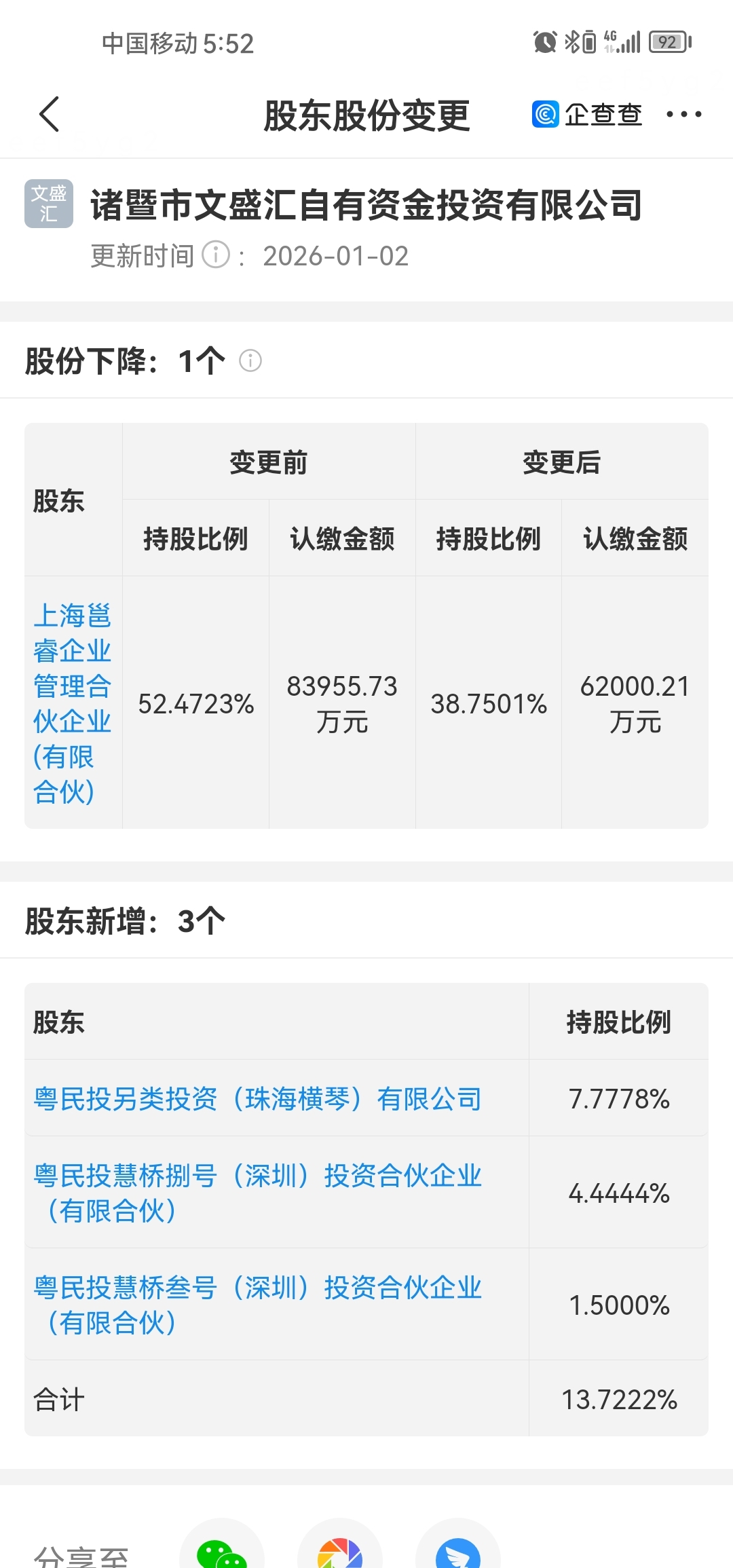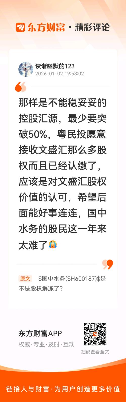 不用,第一大股东就行。我预测的方案大体是:国中增发大约10.7亿股把北京汇源装进国中,这样的话,粤民投这伙贼怂应该分得6000多万股国中(汇源)股份。当然得锁定18个月。//@诙谐幽默的123 :那样是不能稳妥妥的控股汇源,最少要突破50%,粤民投愿意接收文盛汇那么多股权而且已经认缴了,应该是对文盛汇股权价值的认可,希望后面能好事连连,国中水务的股民这一年来太难了