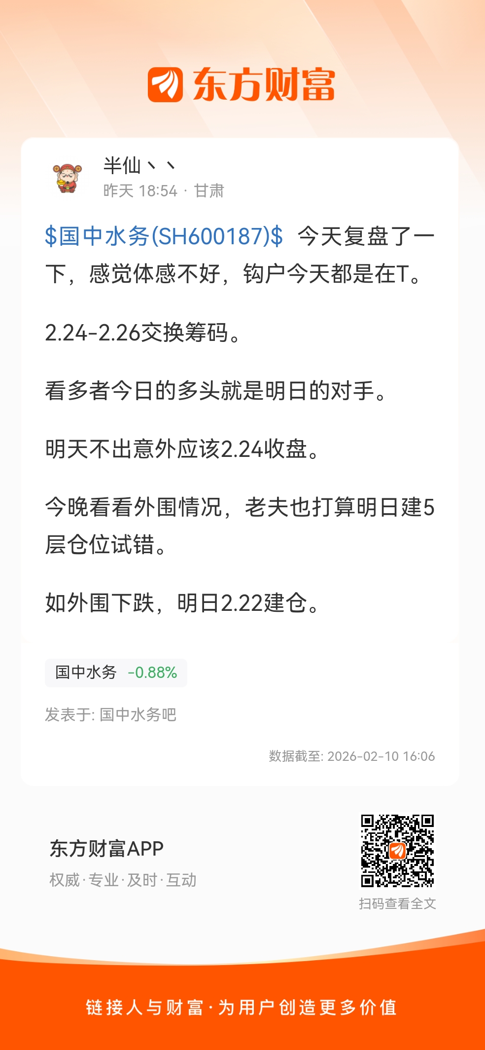 温馨提示: 1.根据《证券法》规定,禁止编造、传播虚假信息或者误导性信息,扰乱证券市场;2.用户在本社区发表的所有资料、言论等仅代表个人观点,与本网站立场无关,不对您构成任何投资建议。用户应基于自己的独立判断,自行决定证券投资并承担相应风险。《东方财富社区管理规定》