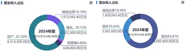 兖矿的生意,好比开了“能源杂货铺”,不只卖动力煤(狭义上指用于火力发电的煤),还生产喷吹煤、焦煤。也就是说,钢厂要的、电厂烧的、化工厂气化的,它都能配。2024年其煤炭业务占营收65.86%,其中自产煤就占了61.20%,毛利率高达48.55%;对比之下,贸易煤的毛利率只有7.62%。显而易见,其真金白银更多来自家矿井。地域上更是四面出击,国内占63.87%,国外占25.64%,真正做到了东方不亮西方亮。