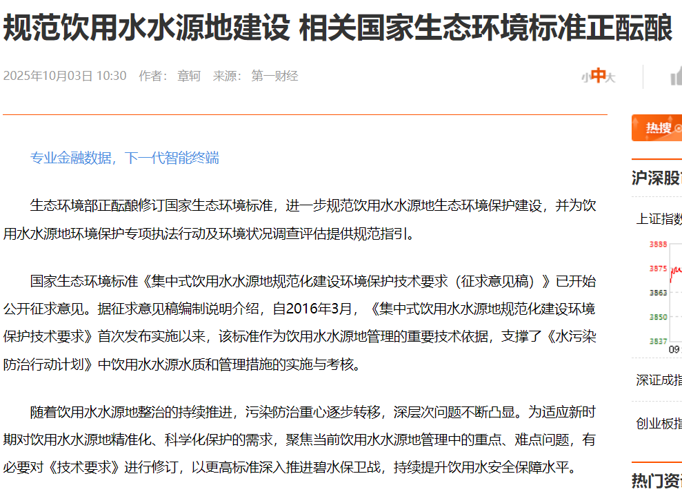 规范饮用水水源地建设相关国家生态环境标准正酝酿