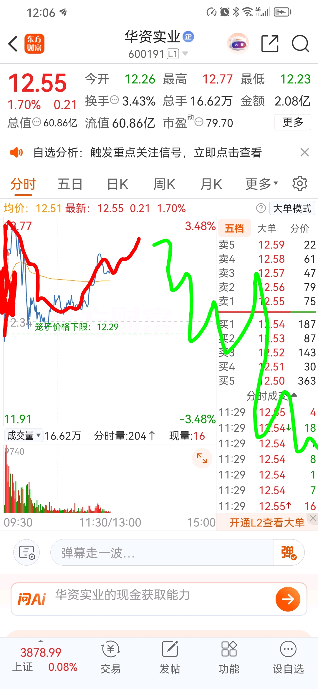 $华资实业(SH600191)$ 今天周一走势,回调到十日线,周二,十日线附近附近再买