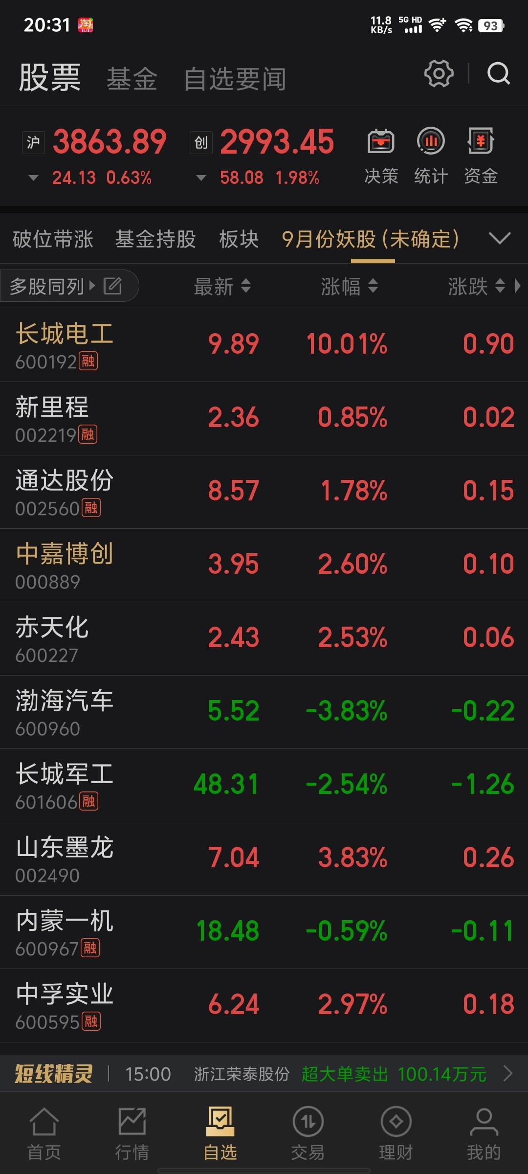 $长城电工(SH600192)$ 这些股都属于九月末,重度回调过后涨起来的的股,其中长城电工上周五破位回调,今天涨停,其次就是长城军工6月23号是第一次翻倍的起点,也许还能有一点点行情,但看10月末将至,冬季要来临了